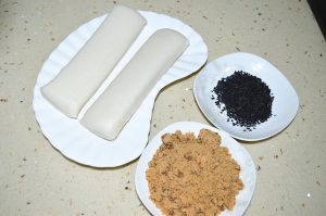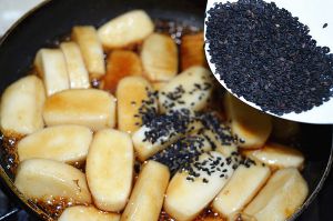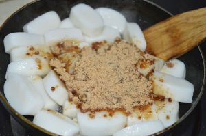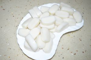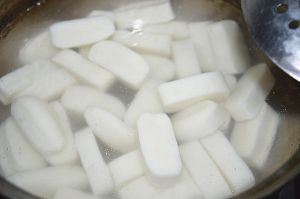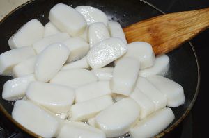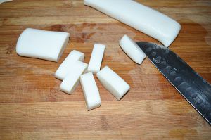将年糕洗净,放在案板上切开。(大概1公分左右的厚度)