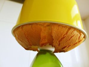 烤好后取出倒扣放凉,方可脱模,烤好的蛋糕,一点都不回缩哦。