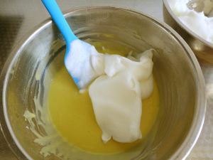 烤箱提前预热,温度设定在170度;取1/3蛋白霜加入蛋黄面糊中,用橡皮刮刀由底向上翻拌均匀;