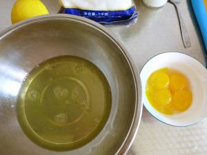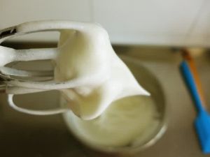 开始打发蛋白,首先在蛋白中滴入几滴柠檬汁;