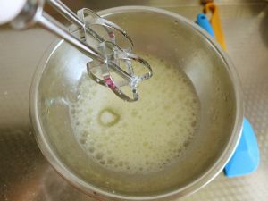 用电动打蛋器低速搅打约1分钟,打散的蛋液,呈现粗大的气泡,此时加入1/2的砂糖,继续搅打;