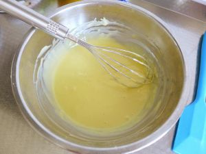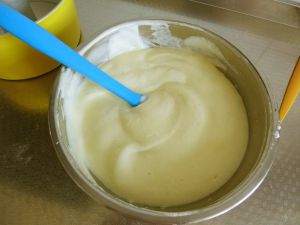 将拌匀的蛋黄面糊,倒入剩下的蛋白中,继续用橡皮刮刀拌匀,拌匀的蛋糕糊是色泽均匀,看不到蛋白颗粒,尚有流动性的;
