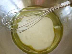 将酸奶及葡萄籽油倒入大盆内,用手动打蛋器搅至完全溶合;