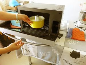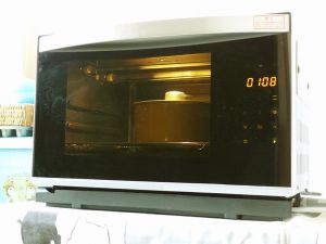 蛋糕模由上向下轻摔数下震去大汽泡后,放入预热好的烤箱中;