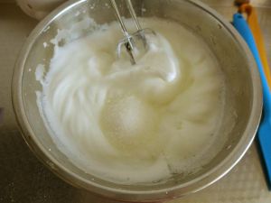 当蛋白的气泡变的细小,体积膨胀至2倍大小时,再加入1/2的砂糖;