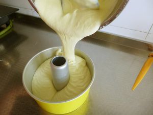 将拌好的蛋糕糊倒入蛋糕模具中,我用的是18厘米中空模;