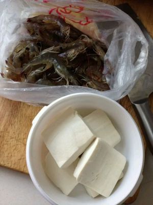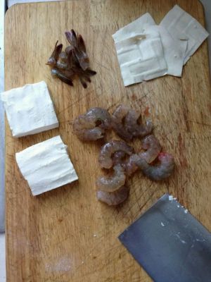 将虾去头,虾去虾线剥壳在尾巴处切断,虾尾留着备用。将虾仁洗净沥干水,将豆腐表面那层去掉(正反两面都去,因为口感不是很好)把虾仁剁碎,豆腐用刀背黏碎,葱取葱白部分,姜切末,将这些混合在一起放入碗里加入适量料酒、白胡椒粉、盐、一个蛋清、干淀粉搅拌,搅拌至有黏性上劲备用。将即食海苔剪细长条备用