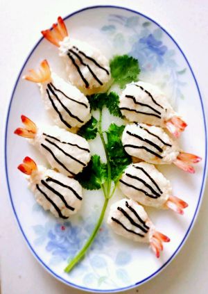将搅拌好的虾仁豆腐装入瓷勺中,在尾处插入虾的尾巴,表面放入三根海苔即可!依次做好剩下的