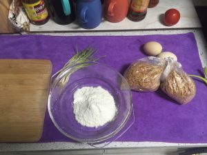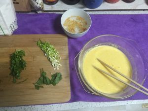 虾米用水淘一下,面粉打入两枚鸡蛋调匀!基本没有面疙瘩,再慢慢加水稀释!水的量不能多,控制到筷子搅拌后拿出不拉丝,但又挂筷子的程度!放置10分钟!同时热锅!