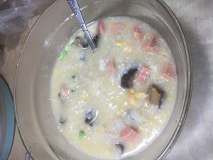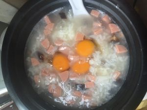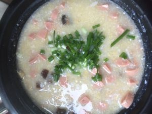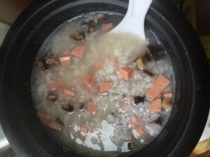 等水开了以后并且米差不多软了,加入香菇丁和火腿丁,搅拌均匀