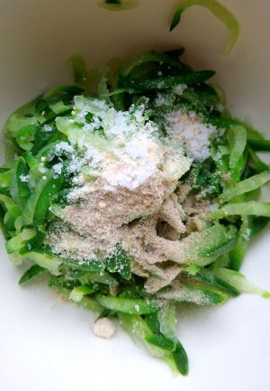 腌制虾的同时,处理萝卜。将萝卜洗净,切丝,焯水后挤净水分,用少许盐和鸡粉拌匀