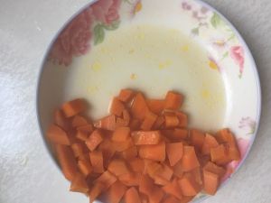 胡萝卜丁加入适量食用油,如橄榄油、婴儿核桃油等,拌匀。入蒸锅蒸至软烂,约15分钟