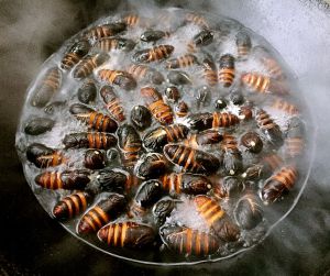 锅中倒入清水烧开,将洗净的蚕蛹在开水中煮熟