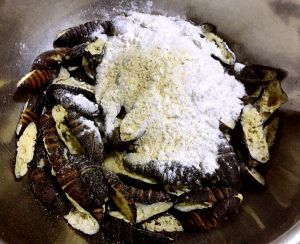 面粉、胡椒粉、盐、糖放入蚕蛹中均匀和开