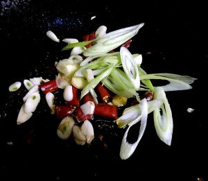 再放入葱姜蒜一起爆香,火不要太大会糊哦
