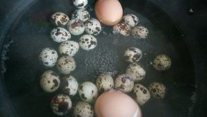 将鹌鹑蛋,鸡蛋洗净放入锅中大火煮开,然后转小火煮5分钟左右。八成熟既可。