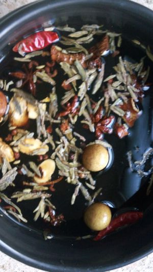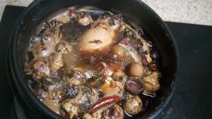 砂锅中放入八角,花椒,干桂圆,茶叶等材料,放入一勺老抽,一勺生抽,一小勺盐,然后将煮好的鹌鹑蛋敲开点皮,(方便入味)放入锅中,倒入清水直到沒过鹌鹑蛋。