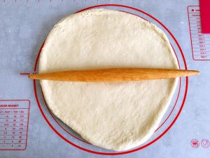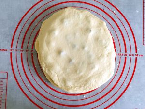 取出发酵好的面团,用擀面杖反复擀压,排出面团内的气体。