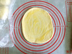 把另外20克黄油放入微波炉叮几秒钟至融化。取一个小面团在揉面垫上再次反复揉按,擀成圆形的面皮。(长行、圆形、方形均可。就是要保证六个面皮的形状都一样。)面皮上涂抹一层融化的黄油。