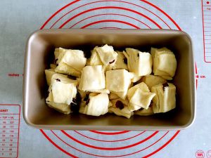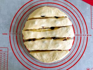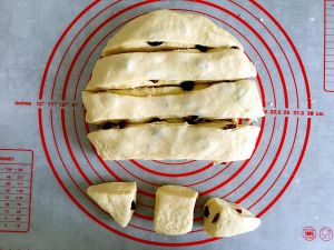 把叠放好的面包生胚四周稍微压一下。用刮板切成均等的条状。