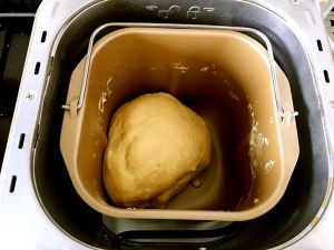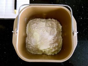 把面包材料按先液体后固体的顺序放入面包桶,再把酵母埋入面粉中,设置两个和面程序。