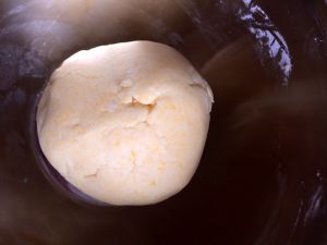 用手揉成面团。此时的面团不怎么湿润,偏干,但能成团。包上保鲜膜,放冰箱冷藏1小时