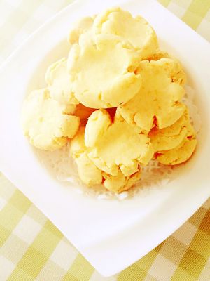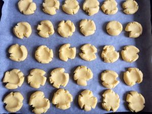 用手挫成8克左右一个小球,依次排好在烤盘上,用大拇指按压下去,成为这种裂开的漂亮纹路