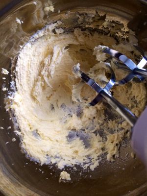 黄油室温下软化,加入糖粉,盐,用打蛋器打发,直至颜色稍变浅,体积膨松