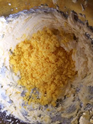 加入过筛蛋黄,搅拌均匀,再筛入低粉,玉米淀粉