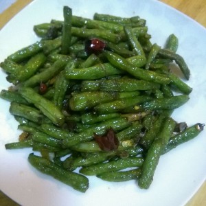 葱姜蒜辣椒爆香,加入炸好的四季豆翻炒。因为四季豆已熟,翻炒加入盐糖酱油调味即可。