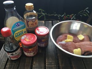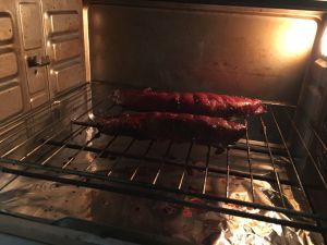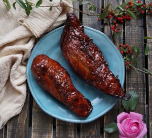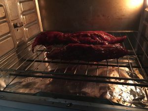 烤箱预热200度,热风烤,把涂好蜂蜜的里脊肉放入中层烤架上,25分钟左右,再翻面烤。其中可以再涂抹1-2次蜂蜜。