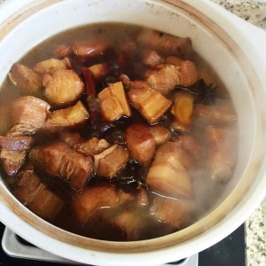 锅内加少许油煸炒,加葱姜蒜,花椒数粒,八角一个红辣椒干一个