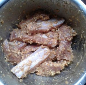 将蒜泥、料酒、盐、胡椒粉辣椒面放入排骨中匀后腌制4个小时以上。