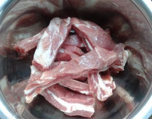 将猪排洗干净砍成15厘米的块状,大蒜剥好之后切成蒜泥。