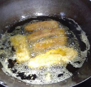 锅里放入适量的油(能没过排骨即可),烧至7成热时,将排骨放进去炸7-8分钟左右至金黄色,捞起装盘。