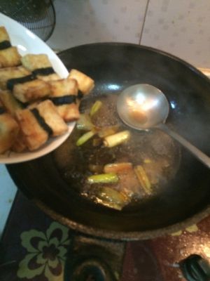 加水一碗,调入少许老抽,一茶匙蚝油,两茶匙白糖,少许鸡粉和适量盐,将豆腐块放入锅中烹煮。