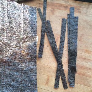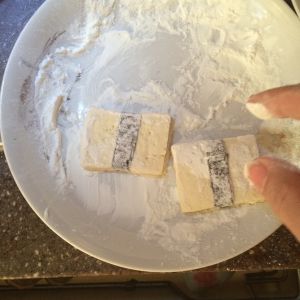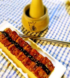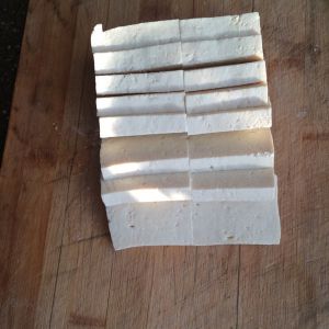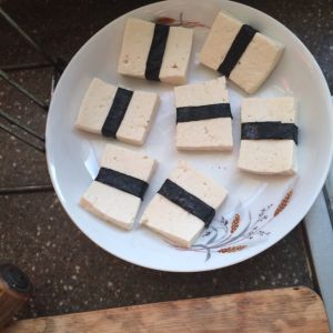 将海苔缠在豆腐中间成腰带。海苔对接部分沾水就粘接上了。