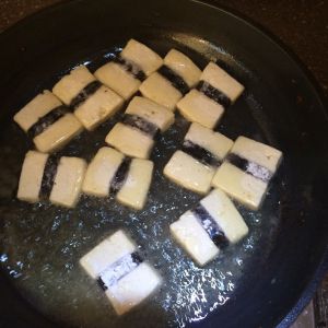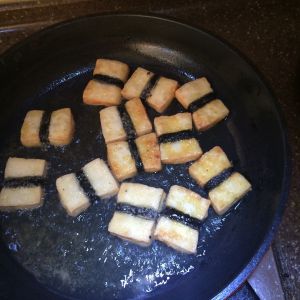 平底锅多放些油,三成油温放入豆腐块改中大火半煎半炸。不要急着翻动或挪动豆腐块。晃动锅子就行。
