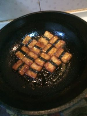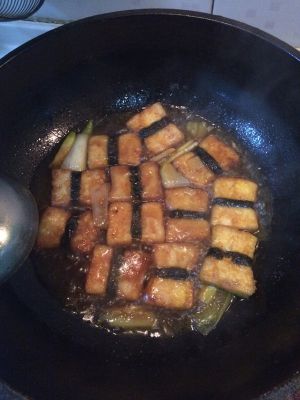不时晃动锅子以免糊底,水少一半时给豆腐翻一面。