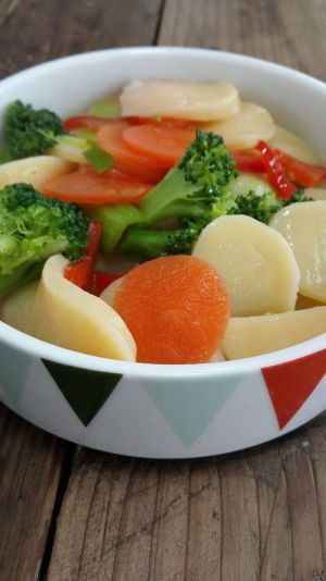 这一步没拍图,锅里加冷水煮开,滴少许山茶油(玉米油 色拉油都可) 然后放入杂蔬,再放入南瓜年糕。