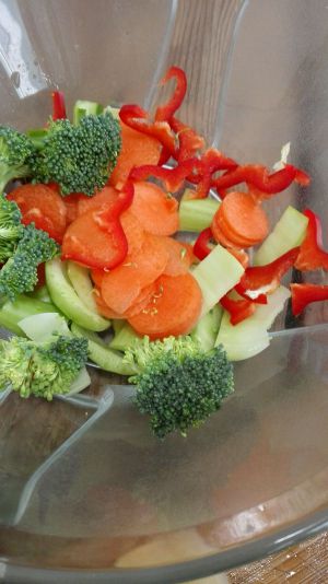 先把杂蔬分类切好,红萝卜切成薄片,甜红椒沿口切成薄片 再切成两半。青菜梗切段就是。