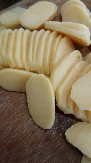 南瓜年糕切成薄片待用