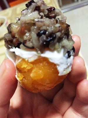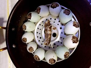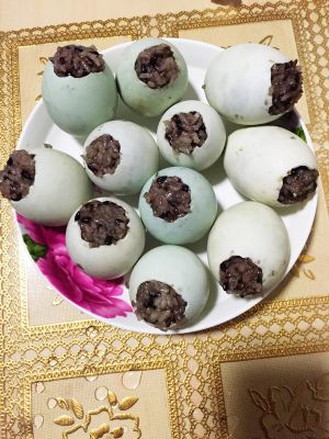 糯米饭填满鸭蛋,放到锅里蒸,我把多余的香肠放在中间,正好看香肠熟了的话,鸭蛋里的蛋黄也就熟了。