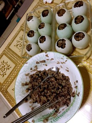 鸭蛋磕一个洞,由于咸鸭蛋的蛋黄腌制的时候凝固了,硬邦邦的,所以放心倒出蛋白,蛋黄不会流出来。