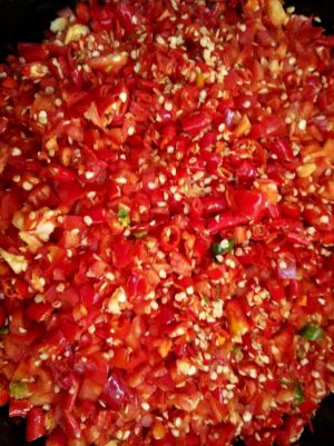 辣椒洗净晾干,剁碎,装入无水的容器。