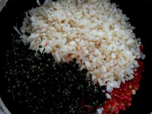 将蒜子,姜剁碎,与花椒,山胡椒一起加入剁碎的辣椒中。