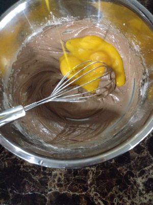 将蛋黄部分材料,放入容器备用。将水,纯牛奶幼糖,色拉油,放在容器用打蛋器搅拌均匀,再添加过筛的低筋面粉,可可粉,玉米粉,搅拌均匀好后加入蛋黄搅匀即可备用!