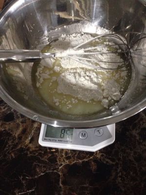 先将1/3的蛋白加入面糊中,由下至上的搅拌均匀!