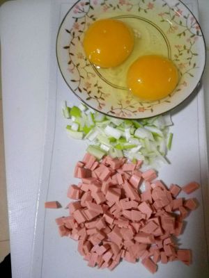 鸡蛋先打两个,香肠切丁,大葱切沫备用