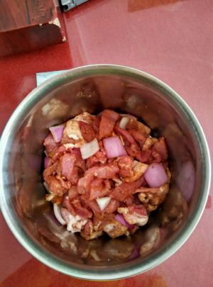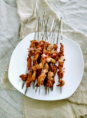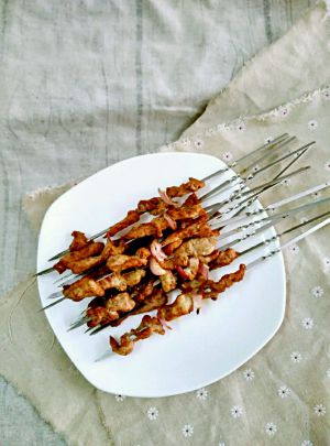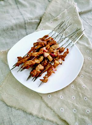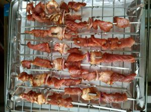 盐好的肉串起来,可以都是瘦的(也可以肥瘦相间)顺便串上点洋葱味道也不错